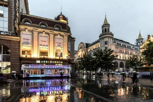 风情浪漫的哈尔滨中央大街雨夜